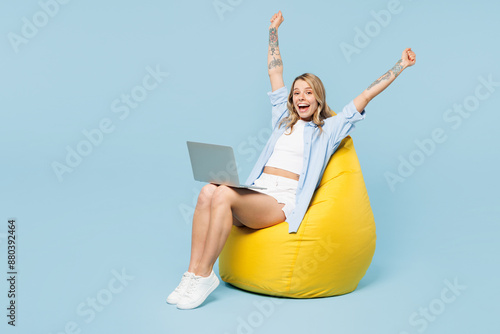 Full body young happy woman wears white top shirt casual clothes sit in bag chair hold use work on laptop pc computer do winner gesture isolated on plain light blue cyan background. Lifestyle concept.