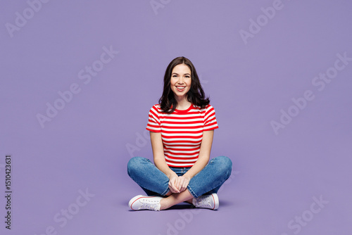 Full body young smiling happy cool Caucasian woman she wear red striped t-shirt casual clothes sit looking camera isolated on plain pastel light purple background studio portrait. Lifestyle concept.
