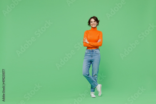 Full body young smiling happy cool fun woman 20s in casual orange turtleneck hold hands crossed folded isolated on plain pastel light green color background studio portrait. People lifestyle concept