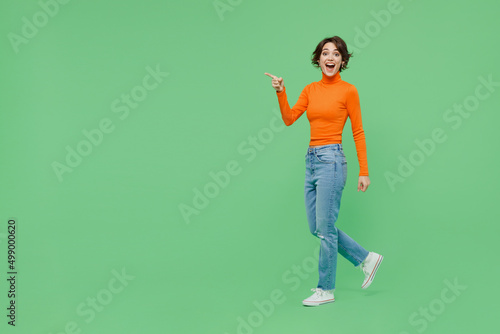 Full body young smiling happy cool fun woman 20s wearing casual orange turtleneck walk going point index finger aside on workspace area isolated on plain pastel light green color background studio