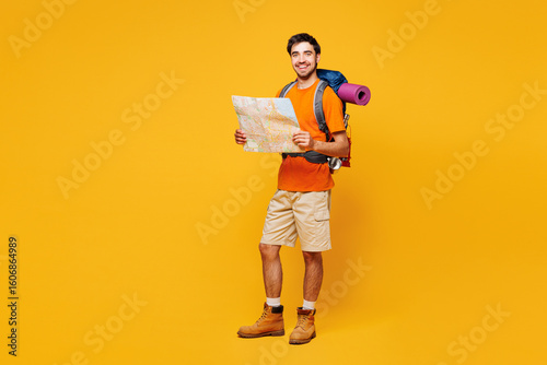 Full body young traveler man carry backpack with stuff mat read paper map isolated on plain yellow background. Tourist leads active lifestyle walk on spare time. Hiking trek rest travel trip concept.