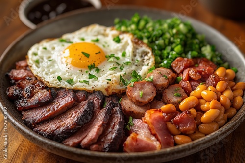 Full english breakfast with fried egg, bacon, sausages, and baked beans
