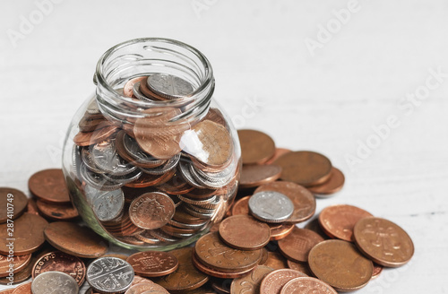Full jar of coins on a table, surrounded by loose change. Money savings concept with copy space.