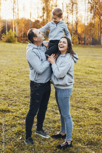 Full lenght of parents holding child on shoulders and playing in park. Happy family. Health care. Family care.
