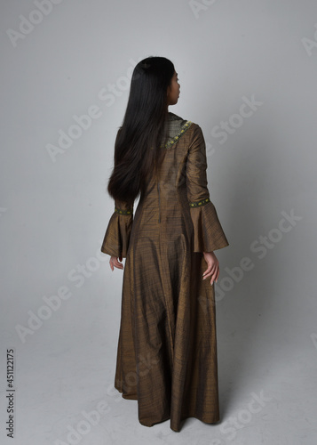 Full length portrait of beautiful young asian woman with long hair wearing medieval fantasy gown costume. Graceful standing posing walking away, isolated on studio background.