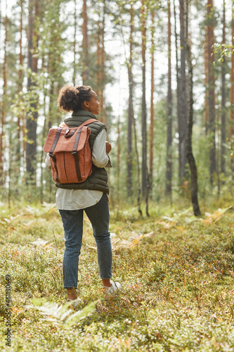 Full length back view portrait of young African-American woman with backpack enjoying hiking in forest lit by sunlight, copy space