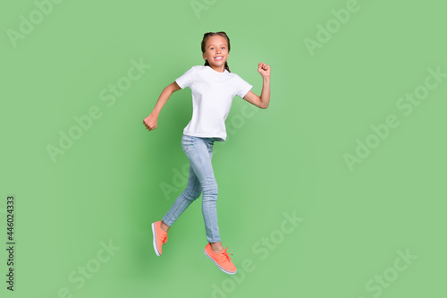 Full length body size photo little girl jumping up running on sale isolated pastel green color background