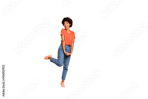 Full length body size photo of curly wavy cheerful charming cute nice lady rejoicing with sales she sees nearby wearing jeans denim isolated over yellow vivid color background