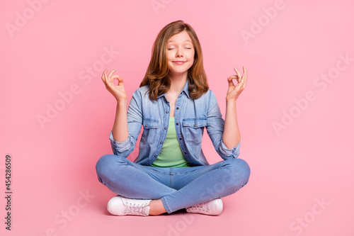 Full length body size photo sitting girl meditating isolated pastel pink color background