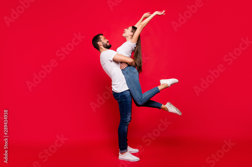 Full length body size view of his he her she nice attractive lovely cheerful cheery free careless spouses spending day dream free spare time having fun isolated over bright vivid shine red background