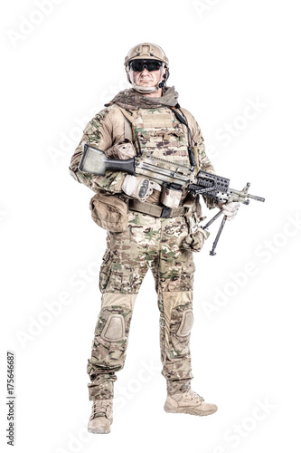 Full length low angle studio shot of big muscular soldier in field uniforms with machine gun, portrait isolated on white background lot of copyspace. Protective goggles glasses are on