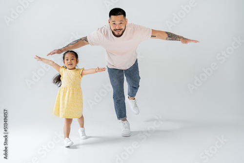 full length of cheerful asian father playing with daughter in yellow dress on grey.