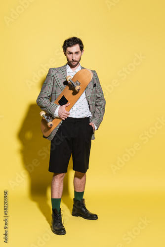 Full length of fashionable man in shorts and jacket holding skateboard on yellow background.