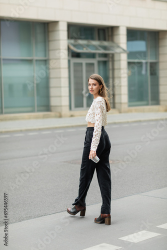 Full length of fashionable young woman in lace top and pants looking at camera, holding coffee to go