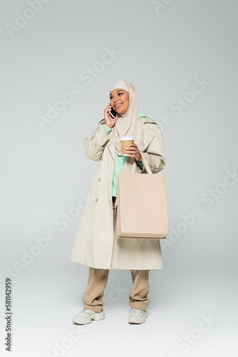 full length of joyful multiracial muslim woman with coffee to go and shopping bags talking on smartphone on grey.