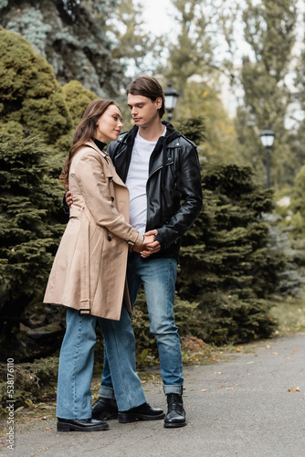 full length of young man and pleased woman holding hands in autumnal park.