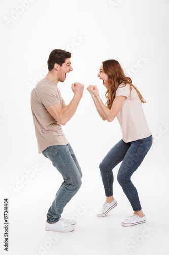 Full length photo of attractive active couple guy and girl wearing beige t-shirts expressing delight standing face to face and clenching fists, over white background