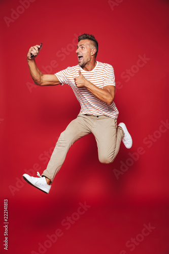 Full length photo of caucasian man in striped t-shirt jumping and taking selfie on smartphone, isolated over red background