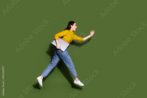Full length photo of charming positive woman wear yellow shirt holding modern gadget jumping high isolated khaki color background