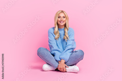 Full length photo of cheerful cute lady dressed street style cozy outfit promoting new collection isolated on pink color background