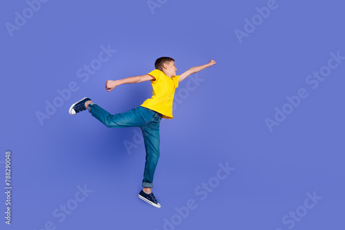 Full length photo of cheerful funny glad boy wear trendy yellow clothes fly air jump up empty space isolated on violet color background