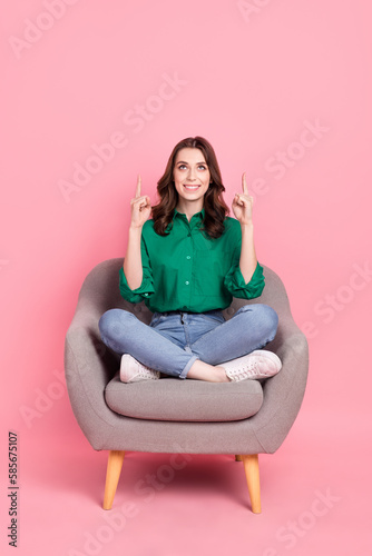 Full length photo of cheerful positive adorable person wear jeans directing at sale empty space sit on chair isolated on pink background