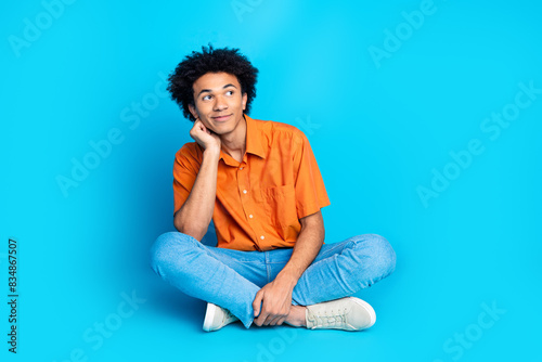Full length photo of dreamy funny guy wear orange shirt smiling looking emtpy space isolated blue color background