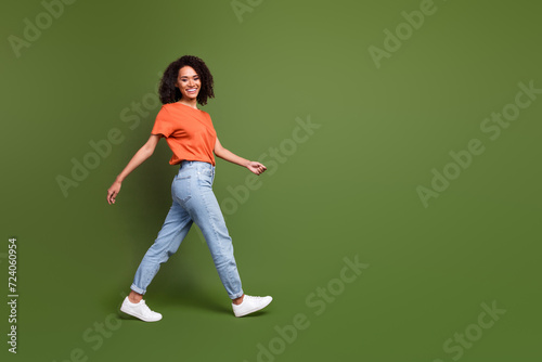Full length photo of excited positive lady dressed orange t-shirt walking empty space isolated khaki color background