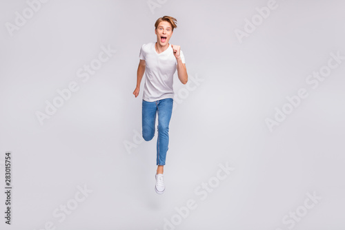 Full length photo of jumping high guy taking part speed race wear casual outfit isolated white background