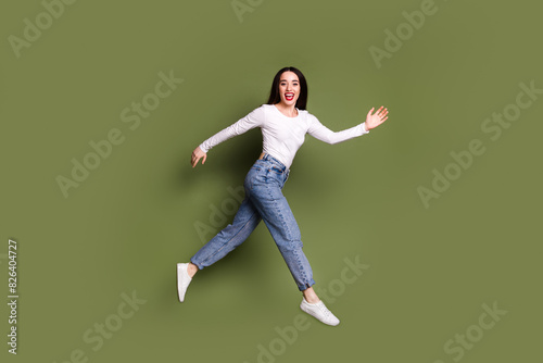 Full length photo of lovely young lady running hurry black friday dressed stylish white garment isolated on khaki color background
