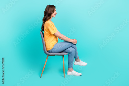Full length photo of pretty shiny lady wear yellow t-shirt looking empty space sitting chair isolated turquoise color background