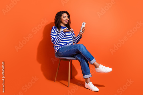 Full length photo of shiny attractive lady dressed striped shirt recording video modern gadget empty space isolated orange color background