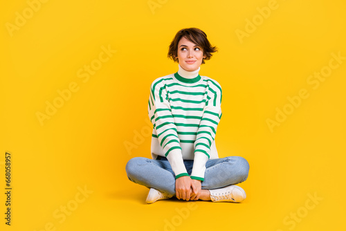 Full length photo of young gorgeous woman wear trendy sweater sit floor look empty ad space thinking isolated on yellow color background