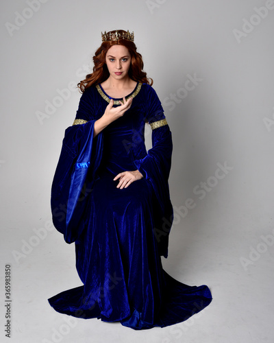 Full length portrait of girl wearing long blue velvet gown with golden crown. sitting pose, isolated against a studio background.