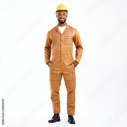 Full length portrait of a construction worker with helmet, wearing a uniform isolated on white background