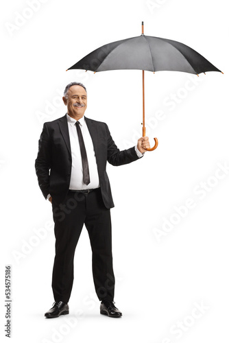 Full length portrait of a mature gentleman holding an open umbrella and smiling