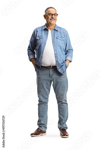 Full length portrait of a smiling casual mature man wearing a denim shirt and jeans