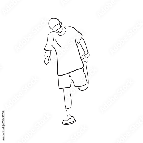 Full length portrait of a sporty man with cap stretching leg illustration vector hand drawn isolated on white background line art.