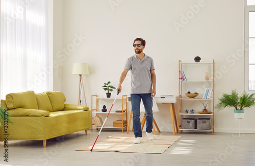 Full length portrait of blind young disabled man in casual clothes with cane walking in the living room at home. Male person with cane indoors. Blindness, disability and vision problems concept.