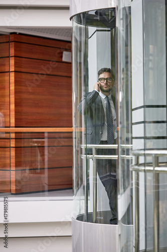 Full length portrait of confident middle-aged entrepreneur wearing classical suit conducting telephone negotiations with business partner while going up in elevator