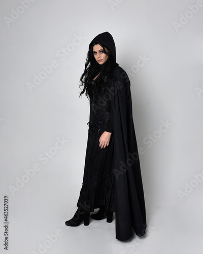 Full length portrait of dark haired woman wearing black victorian witch costume with a flowing cloak. standing pose, with gestural hand movements, against studio background.