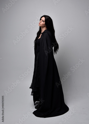 Full length portrait of pretty black haired woman wearing long dark gown and a cloak. Standing pose facing away from the camera, against a studio background.