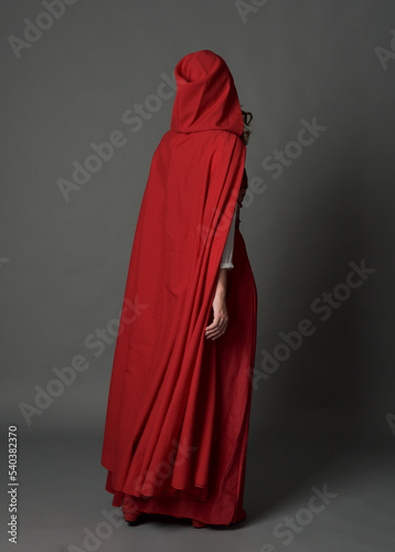Full length portrait of woman wearing red medieval fantasy costume, flowing hooded cloak. Standing pose in backview, gestural hand poses, walking away from camera isolated on grey studio background.