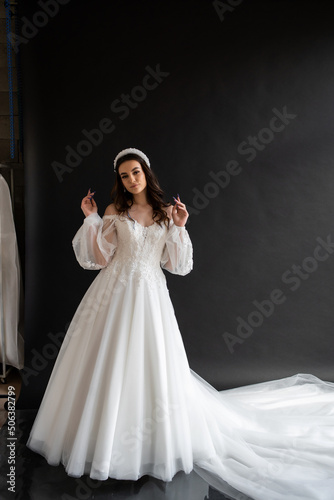 Full length portrait of young beautiful woman wearing white wedding dress. Elegant bride standing and posing