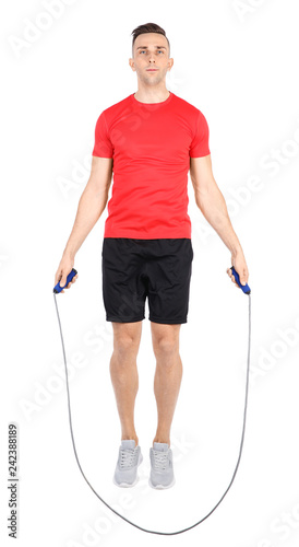 Full length portrait of young sportive man training with jump rope on white background