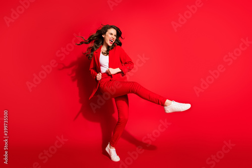 Full length profile photo of lovely young girl dance open mouth raise leg wear jacket trousers footwear isolated red color background