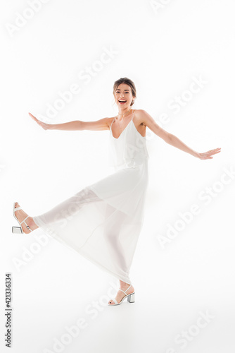 full length view of cheerful bride looking at camera while dancing on white