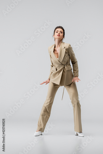 full length view of sensual woman in beige pantsuit looking at camera on grey