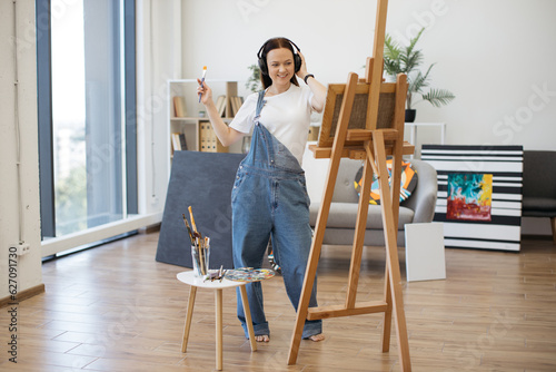 Full length view of young lady in headphones standing barefoot with brush in front of easel with painting. Dancing person drawing inspiration for work from music in wireless device at art space.