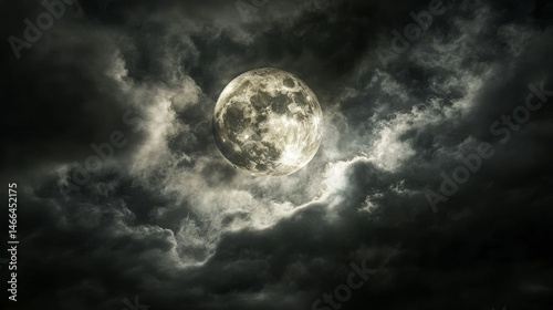 Full Moon Breaking Through Storm Clouds - A majestic full moon illuminates the night sky, breaking through dark and dramatic storm clouds. Symbolizing hope, power, mystery, serenity